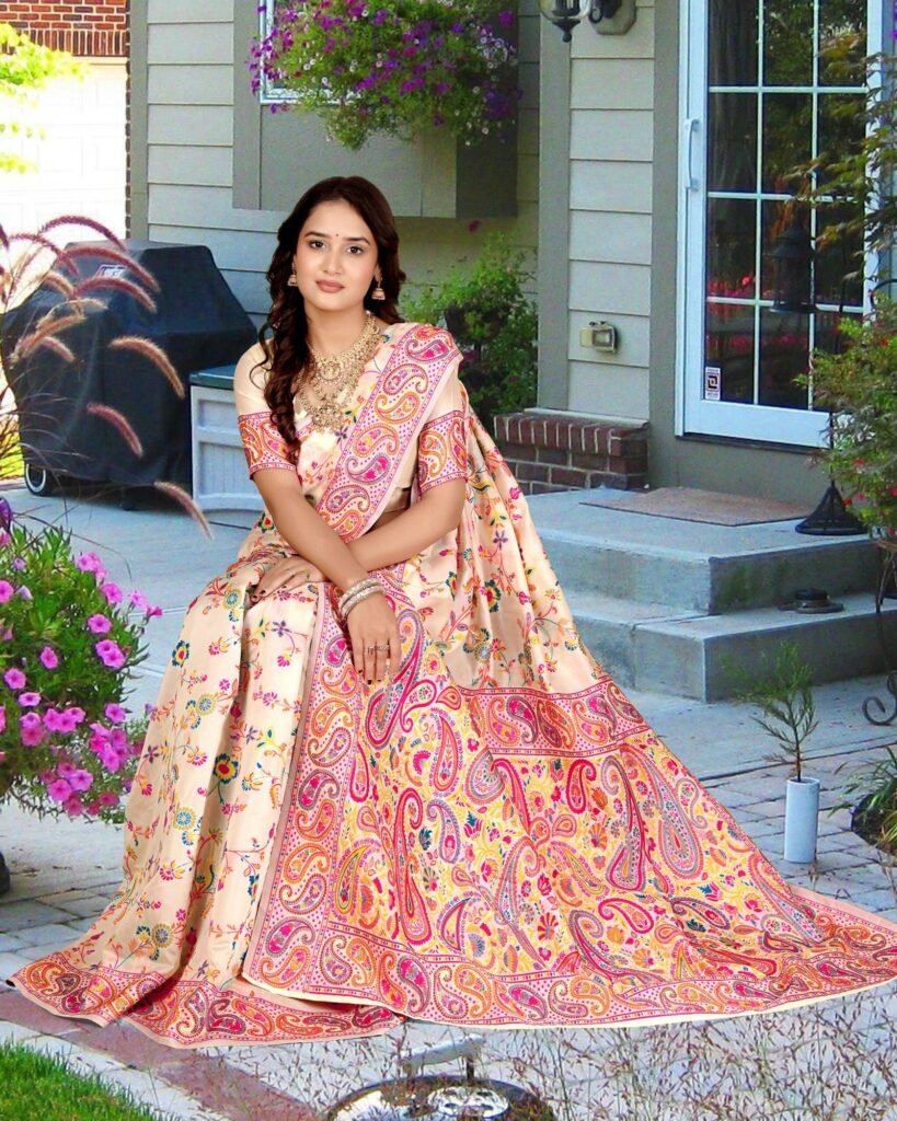 - Fabric: Premium Pashmina Silk Saree (Soft and luxurious blend)