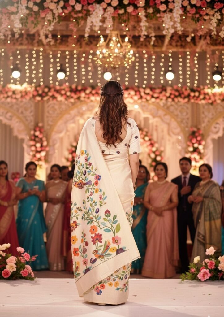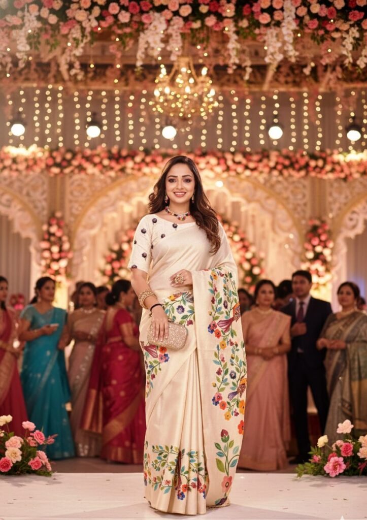 Styling Tip: Pair this exquisite saree with traditional gold or contemporary beaded jewelry, as demonstrated in the image, to complete your enchanting look. Its versatility allows for various styling choices, making it a valuable addition to your collection.