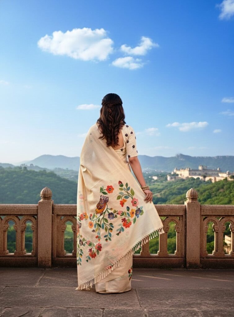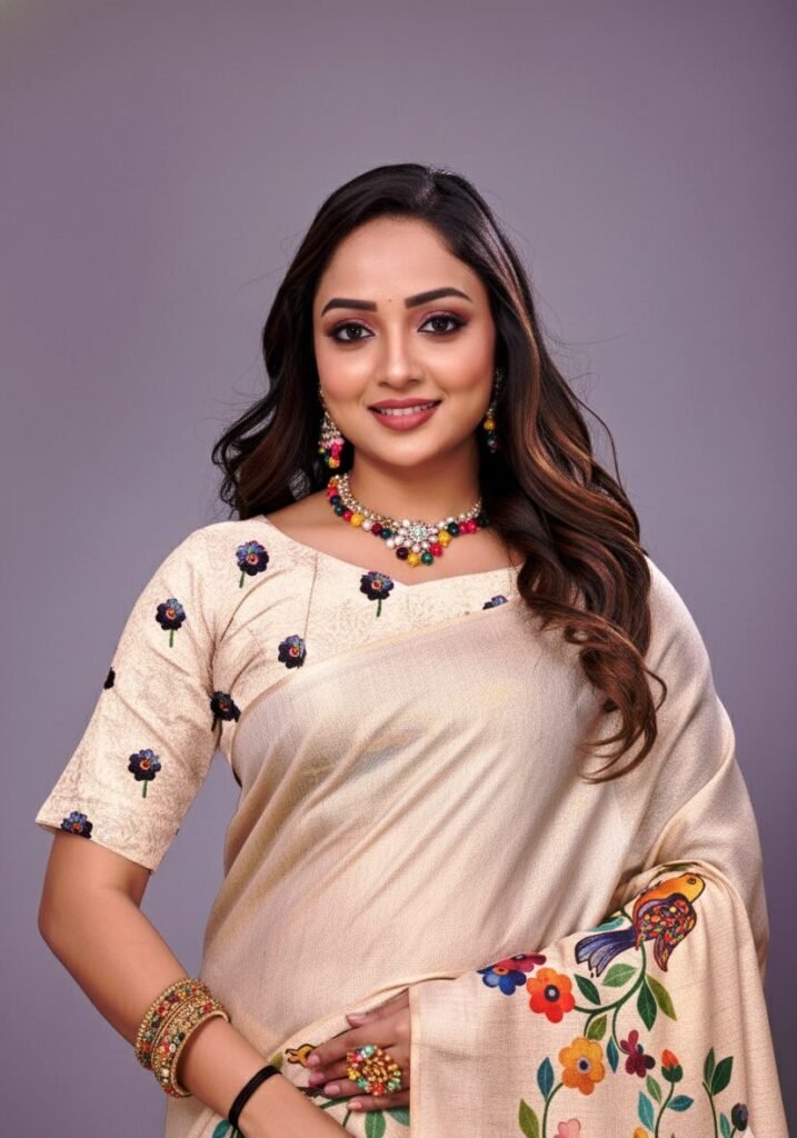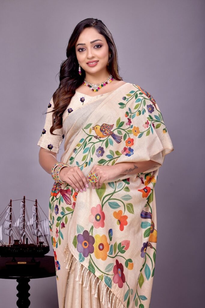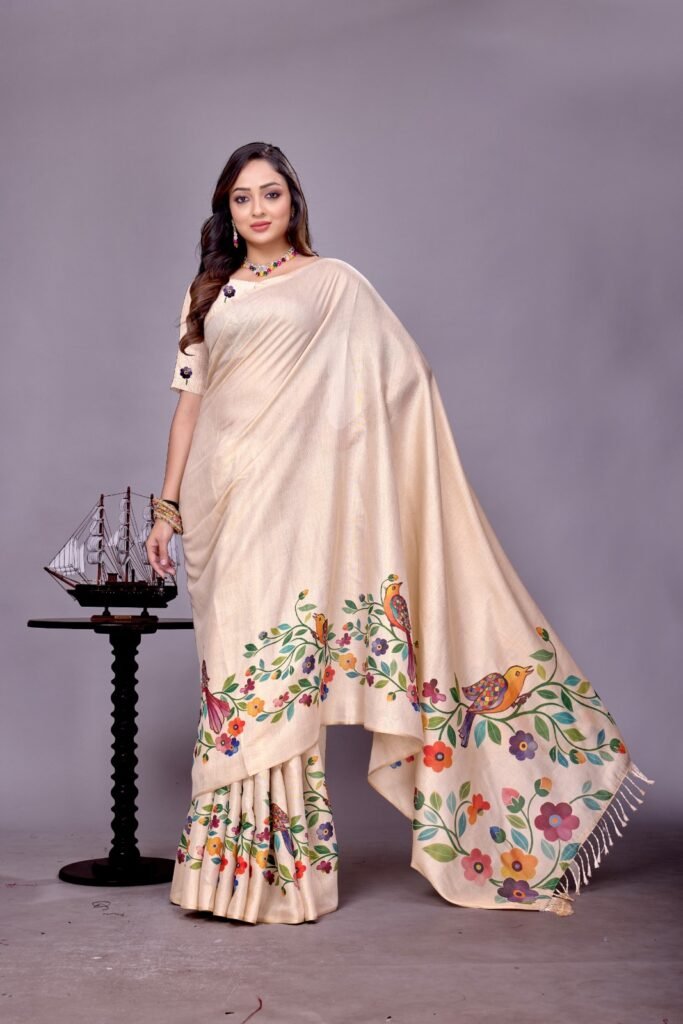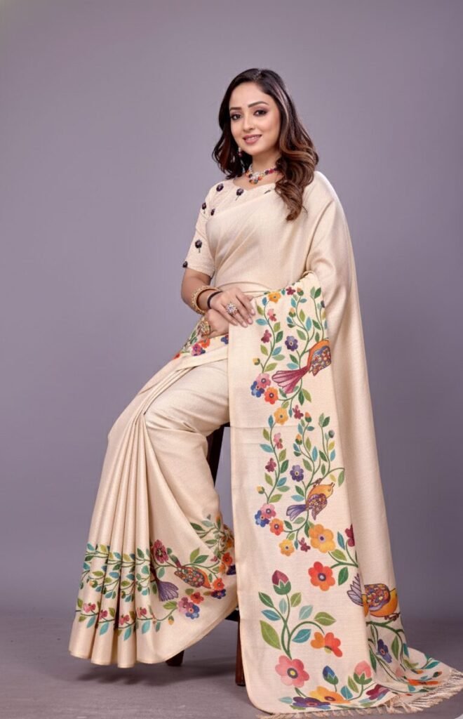 Vibrant Digital Print: Adorned with a captivating digital print featuring intricate floral and foliage motifs in a rich palette of red, green, blue, and gold against a serene cream base. The detailed design extends beautifully across the pallu and body, creating a harmonious and eye-catching look.