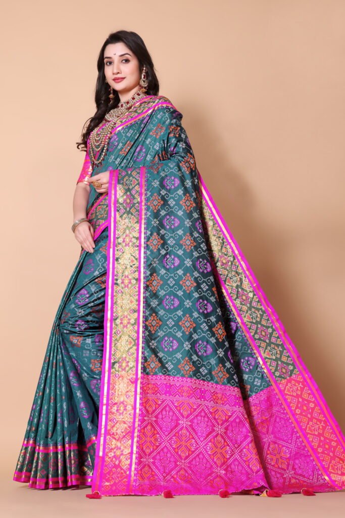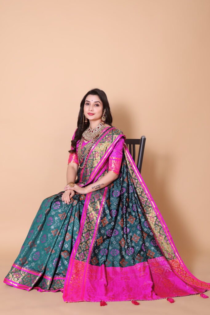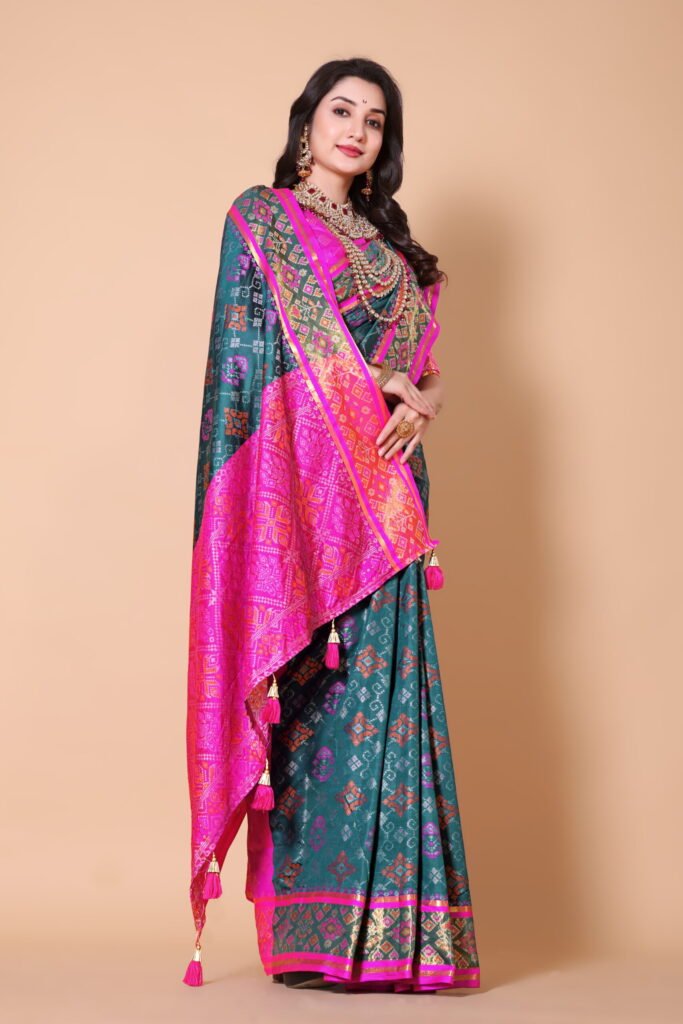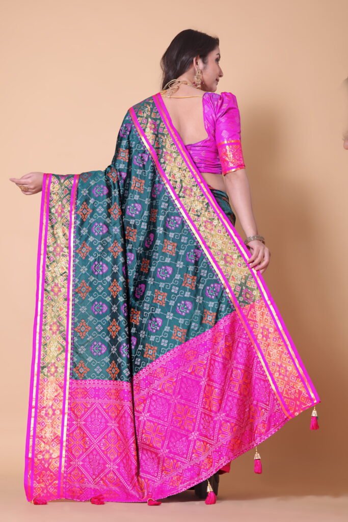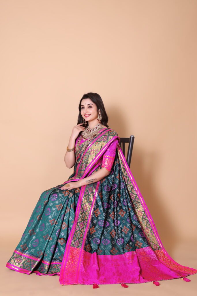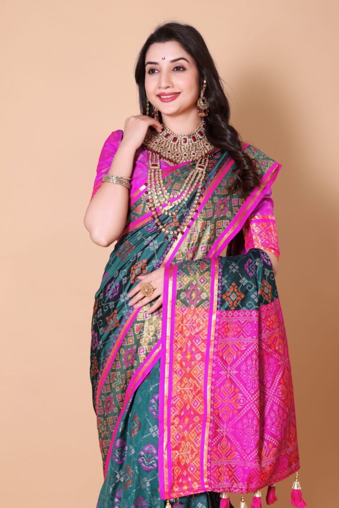 The saree comes in a beautiful teal green shade adorned with multicolor Patola motifs in orange, purple, and pink. The broad pink zari border and pallu with intricate golden detailing give it a grand, festive look. Made from premium Patola silk fabric, it drapes gracefully and offers a rich, lustrous finish.