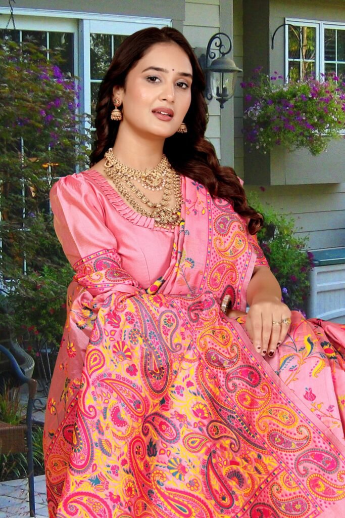 Be the first to review “Pink Semi Pashmina Silk Saree with Multicolor Thread Weaving Work”