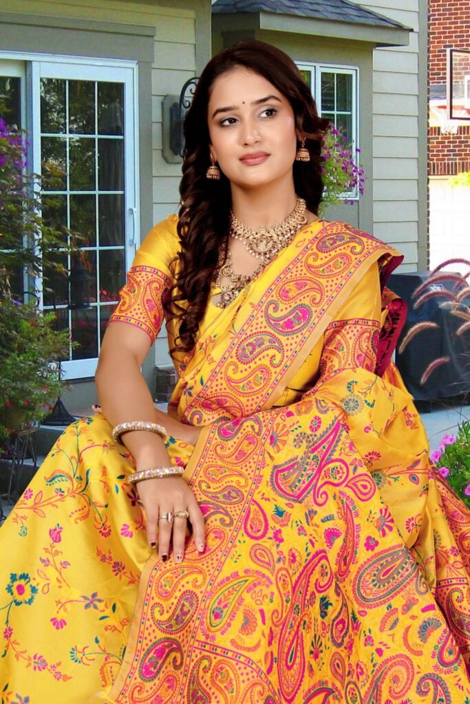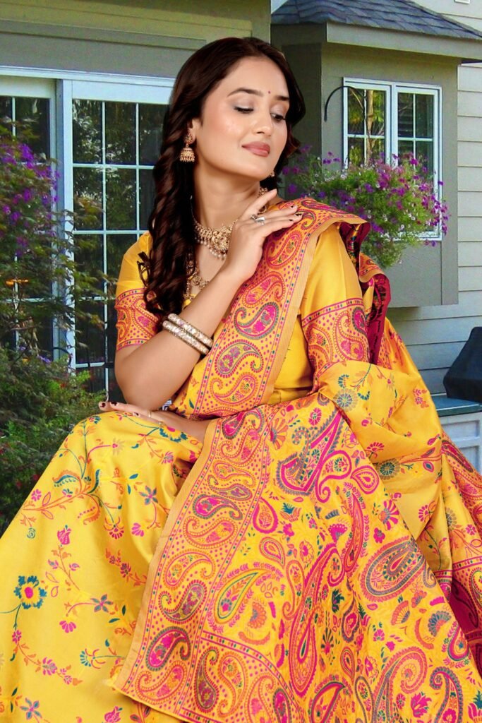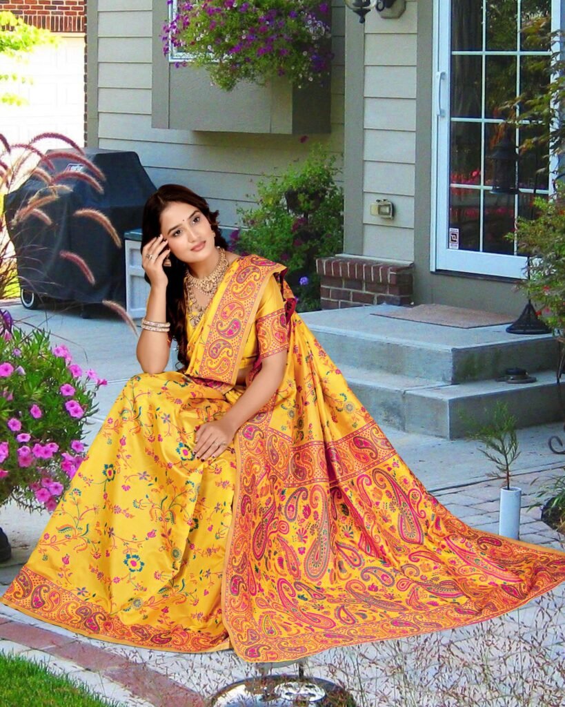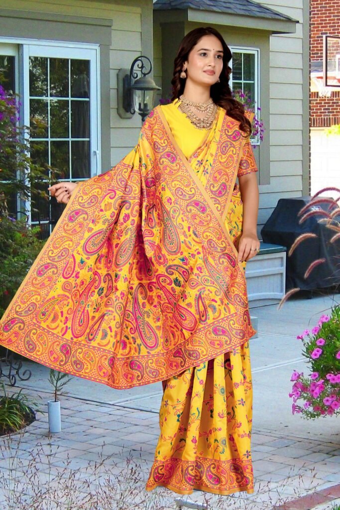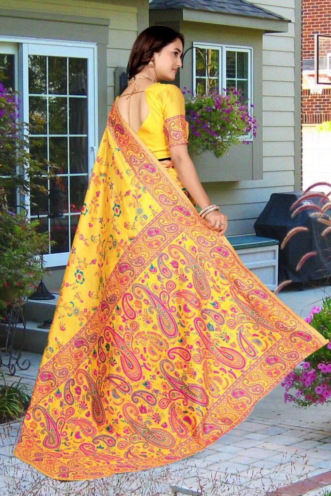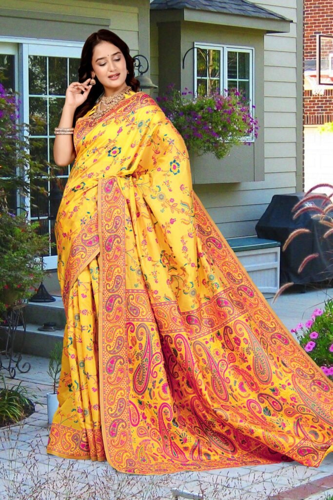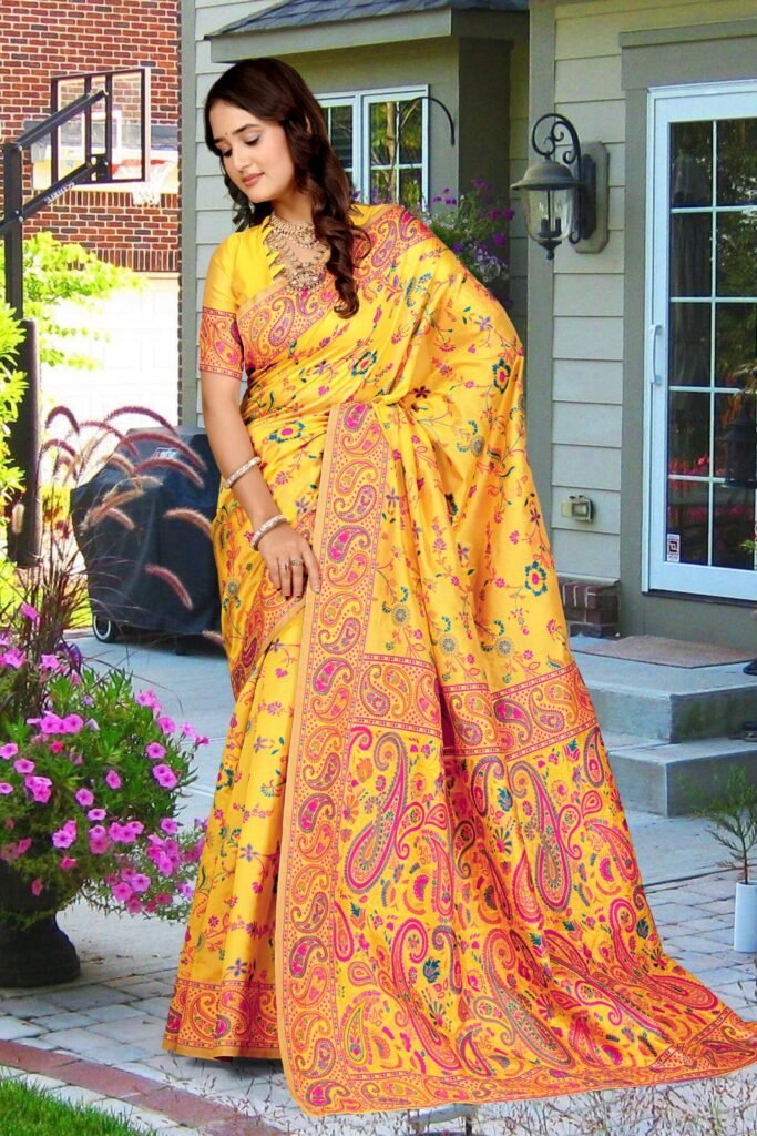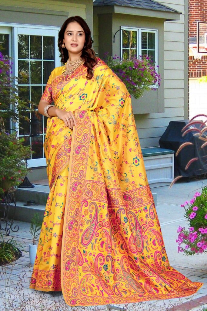 The intricate woven floral and paisley motifs in vibrant hues of yellow, pink, blue, and orange enhance the saree’s regal look. The finely crafted contrast border and pallu add sophistication, making it perfect for festive occasions, weddings, and graceful celebrations.